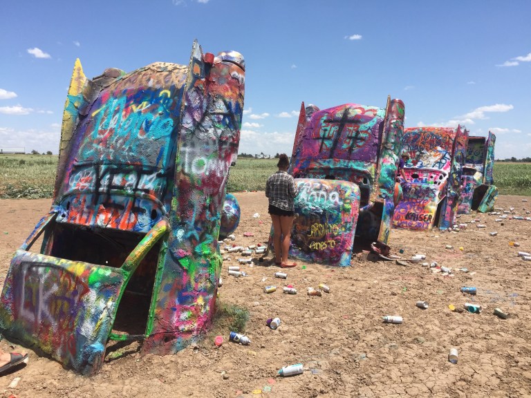 Vi åkte vidare till Cadillac ranch. Jag vet inte riktigt hur jag ska beskriva denna konst/horribla kyrkogård… Det jag kan säga är att Cadillacarna var fullt fungerande när ägaren grävde ner dem 1997.