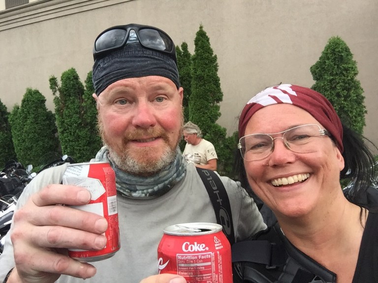 När vi skulle fortsätta mot Chicago var himlen blygrå och det kom några skvättar 🌨. Alla 22 hojarna stannade naturligtvis för att ta på sig regnkläder. Ni som kör hoj vet ju att när man väl fått på sig allt, spricker det upp och man svär ed och förbannelse eftersom man inget ser, då solglasögonen naturligtvis är serstoppade i packväskan 🙄🤥. Efter ett par svettiga mil i den tropiska hettan som uppstår efter ett regn och det är 34 grader, stannade vi för att åla oss ur dessa vattentäta dräkter.