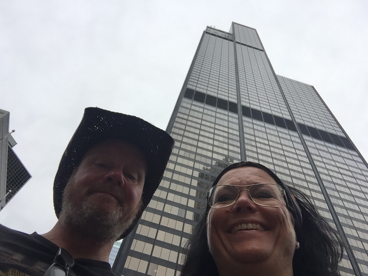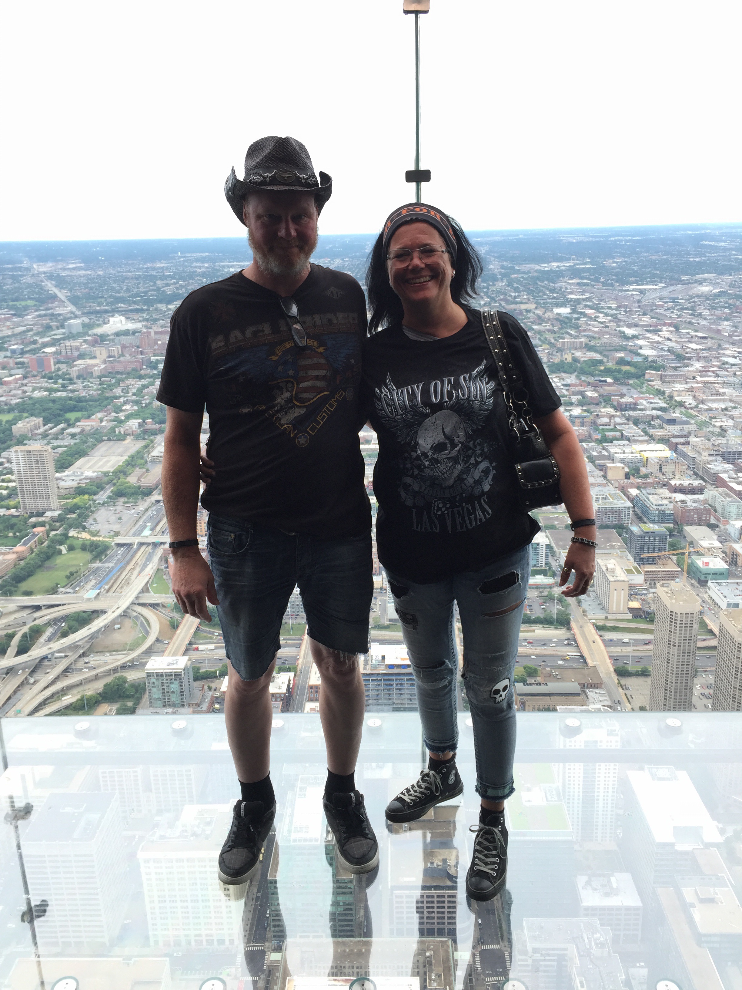 Bussen stannade utan för en skyskrapa som heter Willis Tower. Denna byggnad har den ansenliga höjden av 412 meter och 103 våningar och för att komma upp på sky deck fick man hosta upp över 20$. Turister som vi är, betalade vi snällt och åkte en fullpackad hiss upp till våning 103 för att beskåda den fantastiska utsikten 😲.
