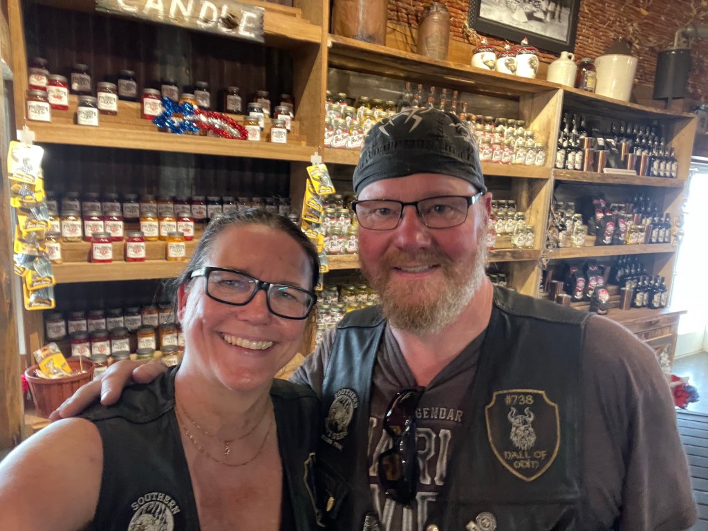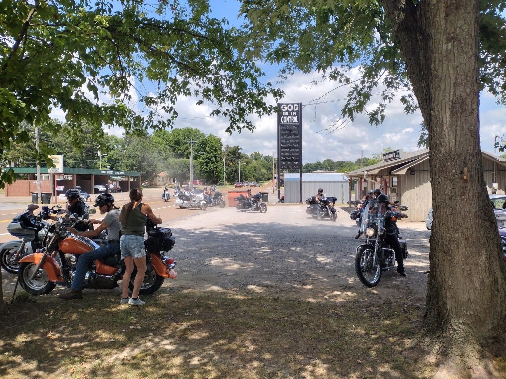 Att vara beväpnad är väldigt vanligt i Tennessee. Man får köpa och bära pistol i Tennessee utan licens om man bär vapnet synligt. Det finns även personer med licens att bära dolt vapen. Detta blev väldigt uppenbart när vi var ute och körde hoj med Memphis chaptret idag. Minst tre av oss sexton personer var synligt beväpnade. Turen gick till ett moonshine destilleri i den lilla byn Trimble, vilket coolt ställe! Destilleriet, baren med försäljning och en scen för uppträdanden, låg alldeles intill varandra.